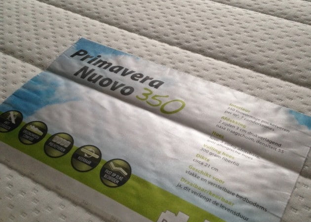 Matras Primavera Nuovo 350 Het matras Primavera Nuovo 350 wordt geproduceerd in Nederland Soort: pocketvering matras voor de luxe slaper die een goed drukverlagend matras zoekt. Uitermate geschikt voor rugklachten. Hardheid per persoon: medium (ca. 60 kg tot ca. 95 kg) Kern: pocketvering, 7 zones, 350 veren per m2 Tijk: witte, afritsbare hoes (reinigen bij de stomerij) Hoogte: 21 cm Afdekking: aan beide kanten 3 cm HR55 traagschuim Extra info: geschikt voor vlakke en verstelbare bedbodems en Oeko tex 100 certificaat Extra info: Dit matras kun je op 4 manieren beslapen. Je kunt het matras dus keren en draaien. De matraskern is namelijk een pocketveringinterieur met 7 zones en de afdeklaag is aan beide ligzijden hetzelfde. Het matras is dus zowel horizontaal als verticaal symmetrisch en daarom op 4 manieren te beslapen. Als je 1 keer per maand/kwartaal keert of draait is dat ruim voldoende. De druk op het matras wordt dan verdeeld en dat zorgt voor een langere